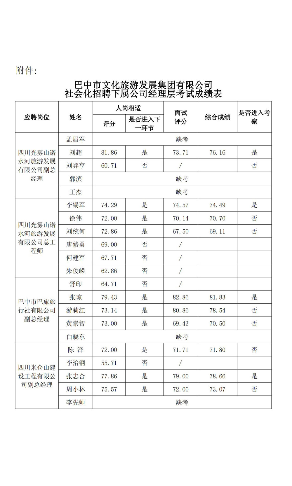附件(jiàn):巴中市(shì)→£文(wén)化(huà)旅遊發展集團有(yǒu)≈<λ限公司社會(huì)化(huà)招聘下(>✘ xià)屬公司經理(lǐ)層考試成績表