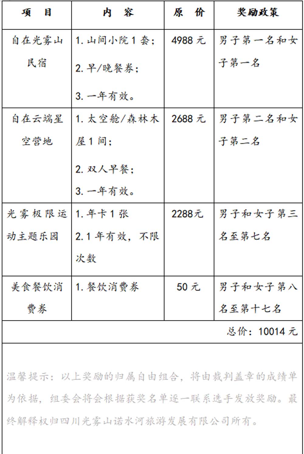 在預備開(kγεāi)跑之際,夏季馬拉松項目運營單位宣漢縣旅遊局也(yě)額外(wài)準備了(le)價值萬☆♥↑•餘元豐厚的(de)獎品來(lái)激勵征戰λ σ光(guāng)霧山(shān)的(de)健兒(ér)們:
