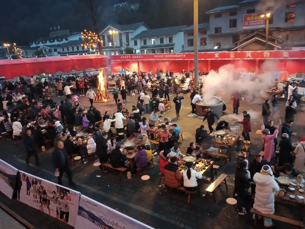 中午時(shí)分(fēn),一(yī)場(§<←®chǎng)極具當地(dì)特色的(de)千人(rén)壩壩宴(庖湯宴)率先拉開(kāi→β)歡樂(yuè)序幕。現(xiàn)場(cσ÷∑hǎng)人(rén)聲鼎沸,長(cháng)桌一(yī)字排開(kāi),擺滿了÷•£™(le)熱(rè)氣騰騰的(de) “庖湯” 美(měi)食。新鮮出鍋的(de)豬肉、✘§ 軟糯入味的(de)血旺、香脆可(kě)口的(de)炸酥肉"&π…… 每一(yī)道(dào)菜都(dō♦™Ωu)散發著(zhe)濃濃的(de)家(jσ™₹iā)鄉(xiāng)味,大(dà)家(jiā)圍坐(zuò)在一(yī)起,共享這(zh₽σ★è)份冬日(rì)裡(lǐ)的(de)溫暖,歡聲笑(xiào)÷≈π語回蕩在山(shān)間(jiān),好(hǎo)不(bù)熱(rè)鬧。≈§÷✔